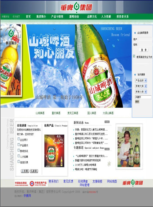 公司擁有“重慶”、“山城”、“國(guó)人”、“麥克王”、“大梁山”以及“天目湖”等品牌啤酒系列產(chǎn)品,以其口味純正、淡爽(醇厚)、包裝美觀大方、風(fēng)味保鮮穩(wěn)定、符合消費(fèi)時(shí)尚等特點(diǎn),在國(guó)內(nèi)具有很高的知名度。1999年,“重慶啤酒”榮登“慶祝建國(guó)50周年”和“澳門回歸”國(guó)宴用酒;2001年,重啤集團(tuán)的“重慶啤酒”、“山城啤酒”和“麥克王”啤酒等六個(gè)品牌又榮獲“中國(guó)優(yōu)質(zhì)新品啤酒”榮譽(yù)稱號(hào)!2002年,“重慶啤酒”又遠(yuǎn)銷香港、澳門和臺(tái)灣地區(qū)。2004年,“山城啤酒”被認(rèn)定為“中國(guó)馳名商標(biāo)”;2005年,“山城啤酒”榮獲“中國(guó)名牌”稱號(hào)。
