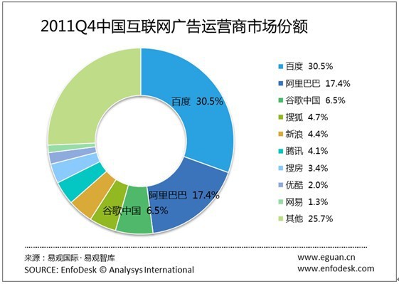 【TechWeb報(bào)道】一月三十一日信息息,EnfoDesk易觀智庫產(chǎn)業(yè)數(shù)據(jù)庫發(fā)布的《2011年第4季度中國網(wǎng)絡(luò)廣告市場季度監(jiān)測》數(shù)據(jù)顯示,百度、阿里巴巴、谷歌中國位居前三,百度占到中國互聯(lián)網(wǎng)廣告市場份額的百分之三十,阿里巴巴占到17.4%,谷歌中國占到6.5%。百度:30.5%,阿里巴巴:17.4% ,谷歌中國:6.5%,新浪(不包含新浪樂居業(yè)務(wù))4.7%、搜狐:4.7%、騰訊4.1%、網(wǎng)易1.3%,搜房3.4%、優(yōu)酷2.0%,其他:25.7%