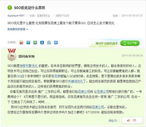 4. 看到這些我們想的不是說(shuō)百度是不是不公平,是不是只許州官放火,不許百姓點(diǎn)燈的情況,大家要是這樣想就錯(cuò)了!大家看看為什么百度知道會(huì)這樣調(diào)整!意義在那里?我們可以借鑒什么?為什么我們做seo做搜索引擎優(yōu)化,不在搜索引擎中去了解他的東西 他的變化 他的發(fā)展,以及他的創(chuàng)新和改變,孫子兵法沒(méi)有教我們 知己知彼嗎?多的不說(shuō)了!說(shuō)多了不招人待見(jiàn)!有其他見(jiàn)解可以私下找我!一起探討!