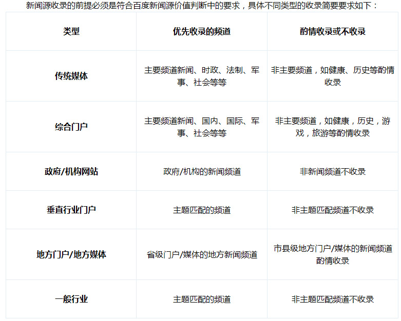 新聞源收錄的前提必須是符合百度新聞源價(jià)值判斷中的要求,具體不同類(lèi)型的收錄簡(jiǎn)要要求如下: