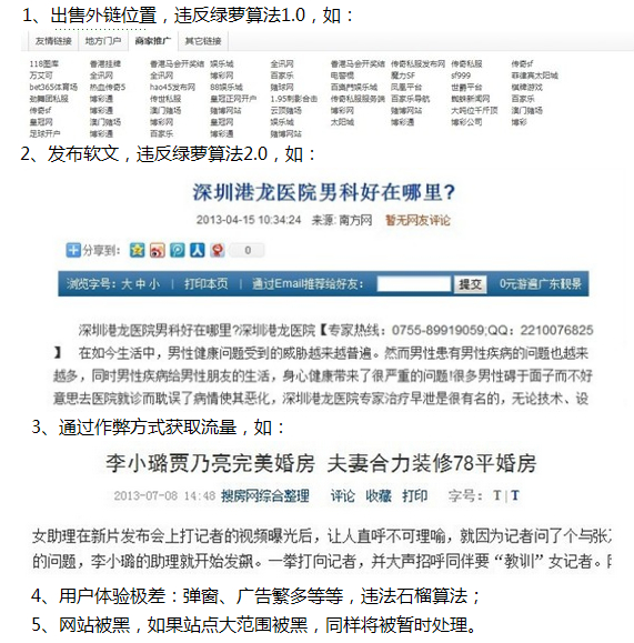 違反如下原則的站點(diǎn)將視嚴(yán)重程度受到不同程度的懲罰:降低搜索引擎系統(tǒng)評(píng)價(jià)、目錄或站點(diǎn)屏蔽清理出新聞源、整站屏蔽清理出新聞源。具體原則包括但不限于如下: