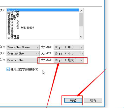 如圖所示,在”代碼視圖“這一欄里面有字體大小。然后把字體大小調(diào)整到16個像素,再點擊下邊的”確定”按鈕。